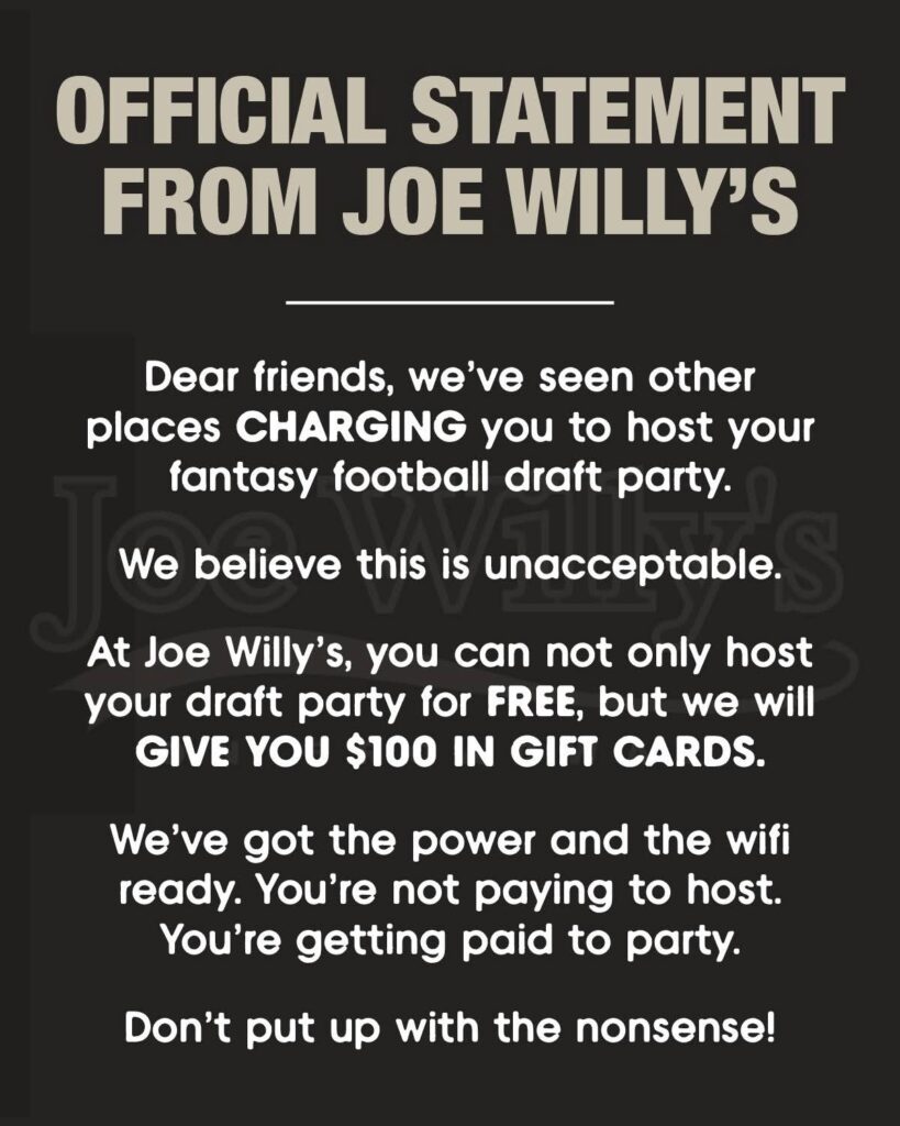 Gather your league and book your party at Joe Willy’s—where great food, cold drinks, and winning vibes come together. Whether you’re a seasoned commissioner or a rookie manager, our space is perfect for Fantasy Football domination.